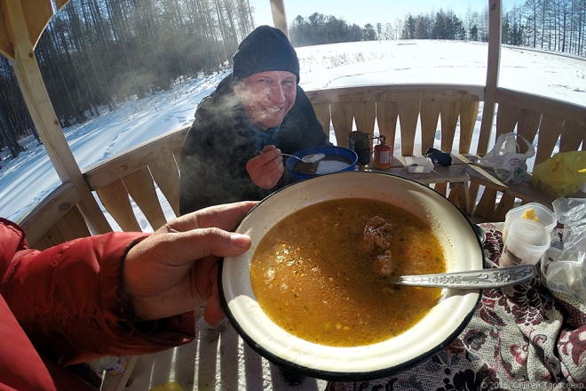 Но мы остановились на обед где-то на трассе в беседке. Там Андрюха и опробовал свою новую газовую горелку. Проезжавшие мимо явно нам завидовали… )
