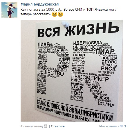 PS: На своей странице Вконтакте Мария разместила пост, который вполне отчётливо отражает её реакцию на происходящее. При этом в ней нет ни капли раскаяния, лишь радость, что благодаря своему поступку и дальнейшему приговору она попала во все СМИ и топ Яндекса. Девушка также предлагает поделиться секретом, как всего за 1000 рублей штрафа за пропаганду нацизма можно устроить себе такой подарок.